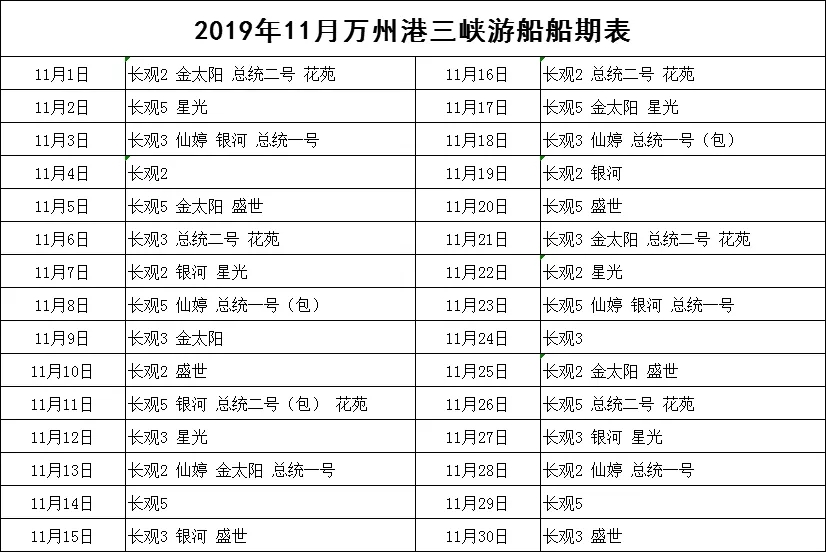 2019年11月萬州港船期信息表